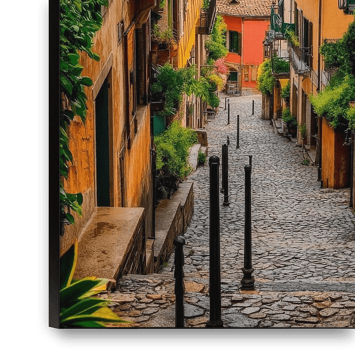 Ein malerischer Abstieg durch enge Gassen, gesäumt von pastellfarbenen Häusern mit floraler Dekoration auf Balkonen. Im Hintergrund glitzert das sanfte Wasser eines Sees, während die altehrwürdigen Pflastersteine Geschichten aus vergangenen Tagen flüstern. Die warme Atmosphäre lädt dazu ein, die Schritte ein wenig langsamer zu setzen…