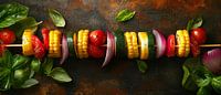 Leuchtende Farben und frische Zutaten vereinen sich auf einem Grillspieß, der das Fingerfood in eine Kunstform verwandelt. Saftige Tomaten, goldener Mais und knackige Paprika laden zum Genuss ein. Dieses Bild wird zum perfekten Hingucker in deiner Küche, inspiriert zu kulinarischen Abenteuern und vermittelt ein Gefühl von Gemütlichkeit…