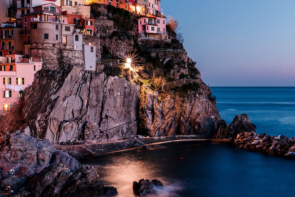 Schönes Dorf am Meer mit bunten Häusern bei Sonnenuntergang. Cinque Terre, Italien.