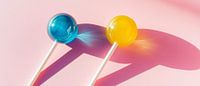 Zwei leuchtende Lollis in strahlendem Blau und Gelb tanzen fröhlich auf einem sanften rosa Hintergrund. Ihre verspielten Schatten sorgen für eine lebendige Atmosphäre, die sofort gute Laune verbreitet. Perfekt für die Küche oder das Esszimmer, wo sie Kinder und Erwachsene gleichermaßen anziehen und zum Naschen einladen!