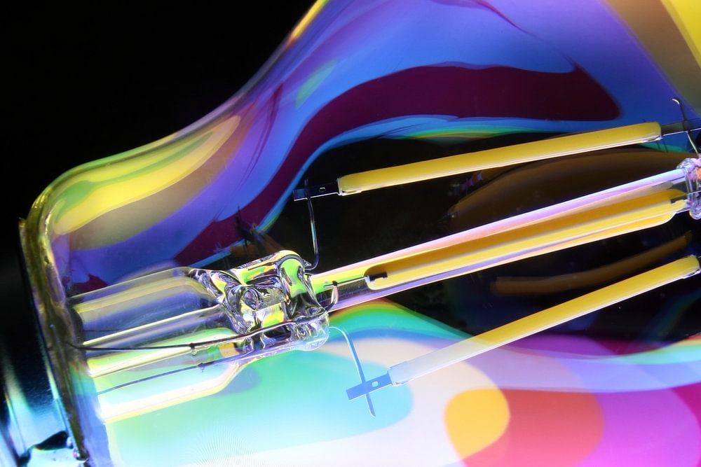Das Besondere an diesem Bild sind die vielfarbigen Reflexionen, die im Inneren der Lampe zu sehen sind. Diese Spiegelungen variieren in den Farbtönen, die sich zu einer schönen Palette und zu Mustern zusammenfügen. Der Hintergrund ist dunkel, so dass der Fokus ganz auf der Lampe und den bunten Spiegelungen liegt.