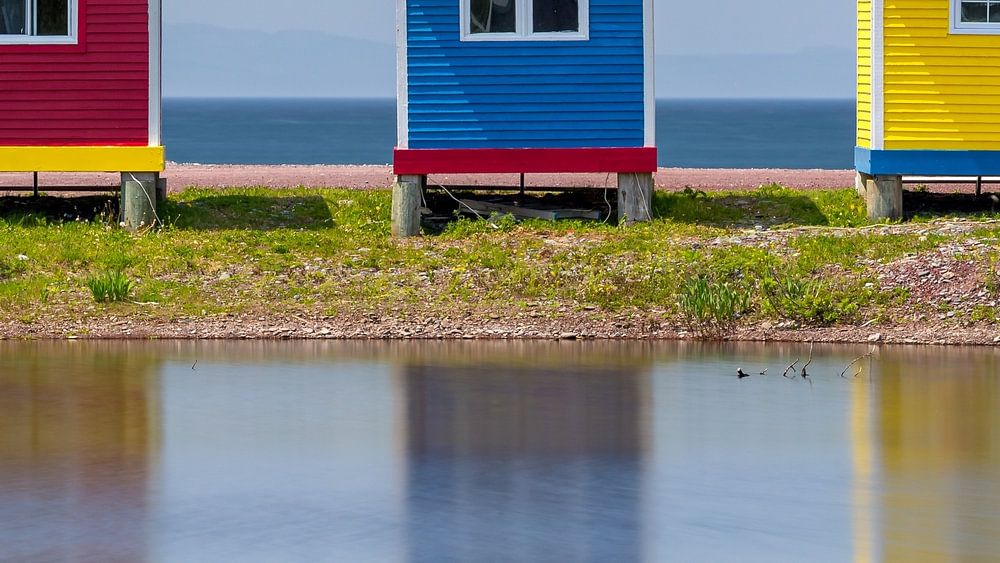 Die berühmten bunten Strandhäuser in Cavendish, Neufundland, stehen direkt am Strand. Sie überblicken das Meer und sind farbenfroh in Rot, Gelb und Blau.