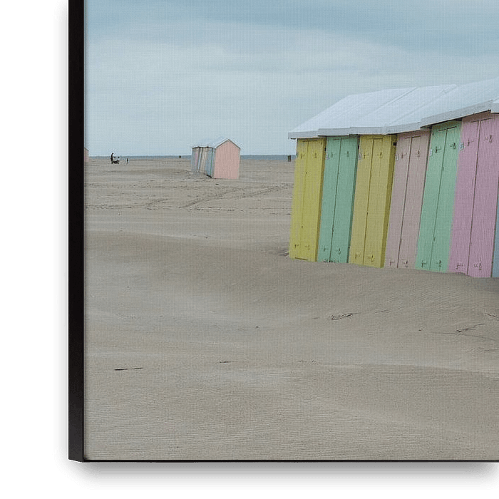 Bunte Strandhütten in Frankreich an der Westküste, der Côte Opale. Sie sind in Pastellfarben gehalten und verleihen dem Strand eine besondere Atmosphäre.
