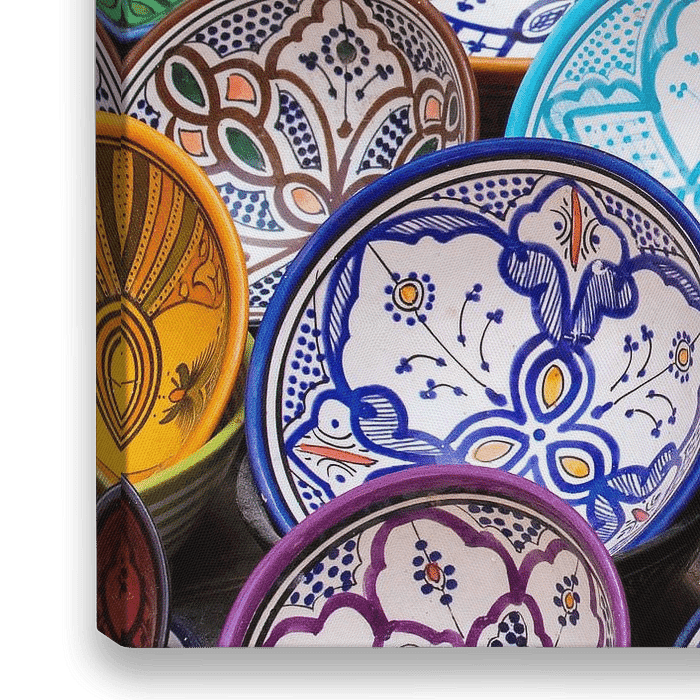 Stilleben mit Töpferschalen in den Straßen von Essaouira, Marokko. Eine Vielfalt von Farben und mit schönen Motiven.