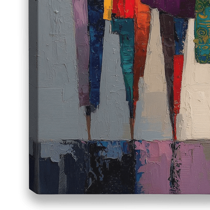 Ein lebhaftes, abstraktes Gemälde mit stilisierten, aneinandergereihten Figuren. Die Figuren zeichnen sich durch ihre langgestreckten Formen und minimalistischen Gesichtszüge aus, die ihre Posen und ihre Kleidung stärker betonen als ihre individuellen Identitäten. Der Hintergrund besteht aus einem Farbverlauf in neutralen Tönen, der die…