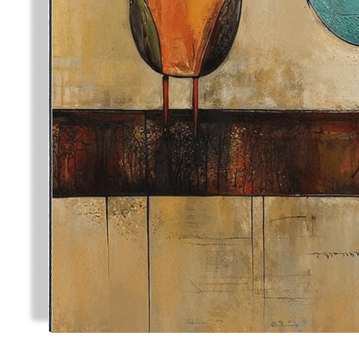 Bunte Vögel - Dieses charmante Kunstwerk mit einer verspielten Reihe von stilisierten Vögeln, jeder mit einer einzigartigen Farbpalette, bringt sofort Leben und Charakter in den Raum. Die verwendete Technik verleiht dem Gemälde einen rustikalen, lebendigen Charme, der perfekt ist, um eine heimelige Atmosphäre zu schaffen. Der subtile…