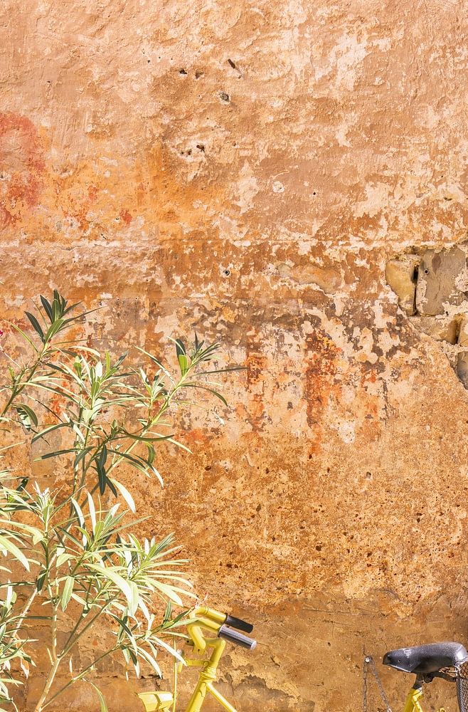 Das Bild hat einen authentischen mediterranen und Vintage-Stil. Der Kontrast zwischen der warmen Terrakotta-Wand und dem leuchtenden Gelb des Fahrrads setzt einen fröhlichen Farbakzent. Diese Wanddekoration passt wunderbar in ein modernes oder industrielles Interieur, aber auch in einen Boho oder eklektischen Wohnstil, in dem Farbe und Charakter im Mittelpunkt stehen.