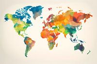 Bunte, künstlerische Weltkarte mit Pinselstrichen in verschiedenen hellen Farben auf einem pastellfarbenen Hintergrund. Ideal für Räume mit viel Licht.