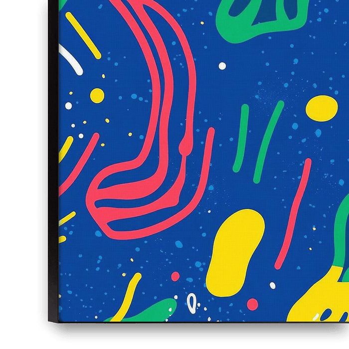 Lebendige Formen und kräftige Farben tanzen auf einem tiefblauen Hintergrund, der sofort gute Laune verbreitet. Die harmonische Mischung aus organischen Linien und klaren, farbenfrohen Akzenten verleiht jedem Raum Freude und Dynamik. Ideal für ein modernes Wohnzimmer oder eine kreative Küche, wo es inspirierende Energie versprüht und…