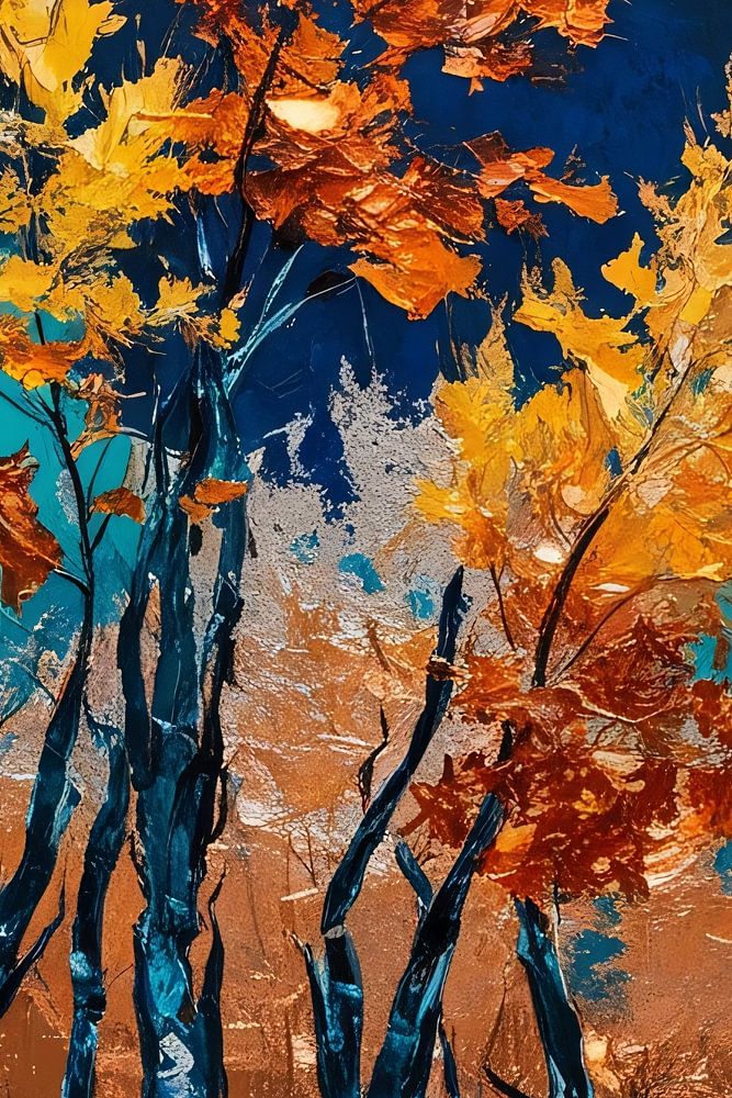 Dieses wunderschöne abstrakte Kunstwerk erweckt die Essenz des Herbstes mit leuchtenden Farben und kräftigen Pinselstrichen zum Leben. Die warmen Orange- und Gelbtöne strahlen Energie und Leben aus, während die kräftigen blauen und türkisfarbenen Akzente einen schönen Kontrast bilden. Die Bäume mit ihren robusten Stämmen und den bunten Blättern scheinen fast im Wind zu tanzen, was einen dynamischen und lebendigen Effekt erzeugt. Die silbernen und grauen Texturen verleihen dem Design eine zusätzliche Tiefe und machen es perfekt für moderne Innenräume. Ob im Schlafzimmer, im Büro oder im Wohnzimmer - dieses Kunstwerk verleiht jedem Raum ein Gefühl von Wärme und Raffinesse.
