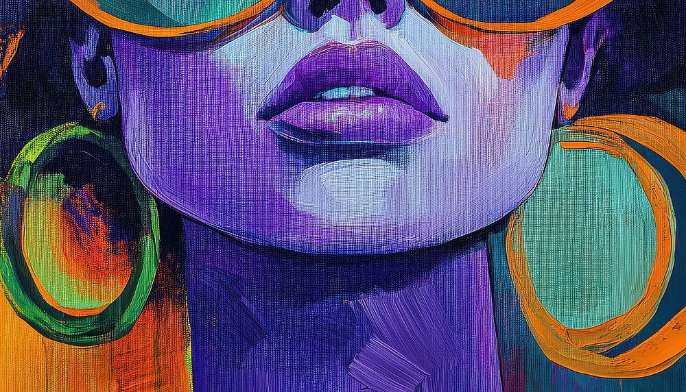 Dieses farbenfrohe und moderne abstrakte Panoramagemälde einer Frau mit Ohrringen und Sonnenbrille ist ein beeindruckendes Kunstwerk, das jedem Raum Stil und Charakter verleiht. Das Bild zeigt eine moderne Frau mit großen Ohrringen und modischer Sonnenbrille, die in einem ausdrucksstarken abstrakten Stil dargestellt ist, der sofort die Aufmerksamkeit auf sich zieht.