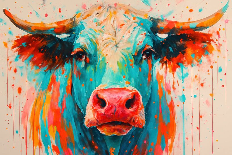 Ein frontaler Kuhkopf füllt das Bild mit breiten Hörnern, einer kräftigen Schnauze und lebhaften Farbspritzern, die in langen Tropfen herunterlaufen. Türkis und Koralle heben sich von warmen orangefarbenen Akzenten ab, während ein heller Hintergrund den Kontrast verstärkt. Lockere Pinselstriche und Spritzer sorgen für Bewegung und…