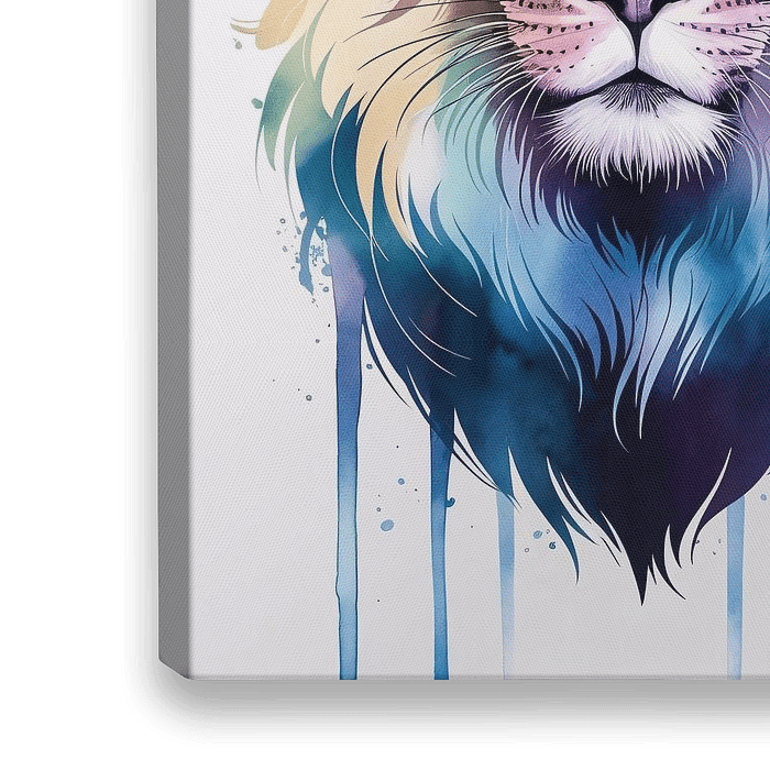 Bestelle dieses abstrakte Wandbild Bunter Löwe Aquarell Porträt von Art & Soul Creations als Reproduktion auf Leinwand, Alu-Dibond, als Poster, Fototapete oder Acrylglasbild.