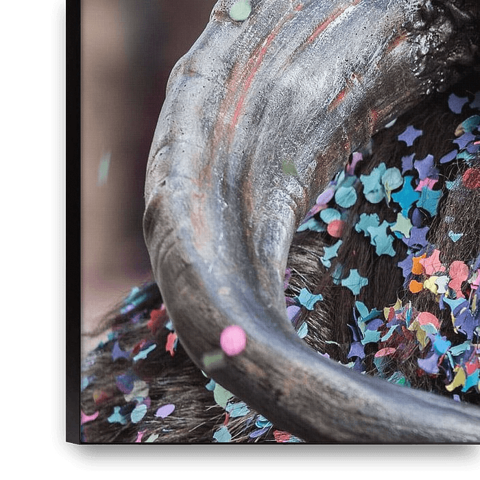 Dieses faszinierende Foto zeigt einen Mann, der wie ein rauer Wikingerkrieger gekleidet ist und dessen Gesicht teilweise von einem imposanten Metallhelm verdeckt wird. Seine stechend blauen Augen und sein intensiver Blick strahlen Stärke und Entschlossenheit aus. Sein dichter, dunkler Bart ist mit buntem Konfetti übersät, wodurch ein…