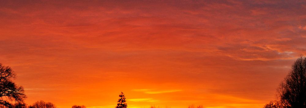Ein Panoramafoto eines leuchtend bunten Himmels bei Sonnenuntergang. Schöner Abend rot durch eine schöne Skyline von Bäumen. Der Himmel zeigt die Schattierungen von Orange, Pink, Gelb und Blau.