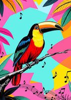 Eine lebhafte Illustration zeigt einen Tukan, der auf einem Ast sitzt, umgeben von Musiknoten und buntem Laub. Der Tukan hat einen schwarzen Kopf, einen gelben Hals, eine rote Brust und einen großen, mehrfarbigen Schnabel. Der Hintergrund besteht aus geometrischen Formen in Rosa-, Gelb- und Türkistönen, die eine lebendige und tropische…
