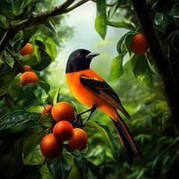 Mit seinem leuchtenden orangefarbenen Gefieder und dem kontrastierenden schwarzen Kopf wirkt der Vogel wie ein lebendiges Stück Kunst aus einem tropischen Paradies. Umgeben von saftigen, reifen Orangen schimmert das Grün des Blätterdachs und lässt die Szene magisch und harmonisch erscheinen – ein perfektes Zusammenspiel von Farben und…