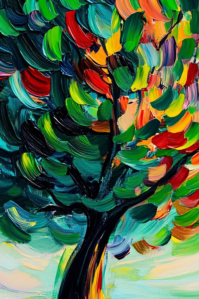 Bringen Sie Farbe und Energie in Ihr Interieur mit diesem lebendigen Kunstwerk eines farbenfrohen Baumes. Die kräftigen Pinselstriche und die Mischung aus warmen und kühlen Farben sorgen für einen dynamischen Look. Das Design kombiniert natürliche Schönheit mit abstrakter Kunst und eignet sich daher perfekt für moderne Räume wie Büros und Wohnzimmer. Der Baum strahlt Leben und Bewegung aus, während die einzigartigen Texturen und leuchtenden Farben jeden Raum zum Leben erwecken. Dieses Gemälde ist ideal für alle, die Natur und Kreativität in einem dekorativen Stück vereinen möchten.