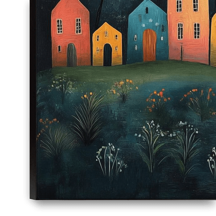 Buntes Dorfpanorama-Gemälde in leuchtenden Farben, das jedem Raum ein luxuriöses Flair verleiht. Sein einzigartiges und stilvolles Design macht es zu einem echten Hingucker. Die schönen Farben und das ungewöhnliche Design machen dieses Kunstwerk zu 100% originell. Es ist der ideale Fotodruck, um Ihr Interieur zu vervollständigen.