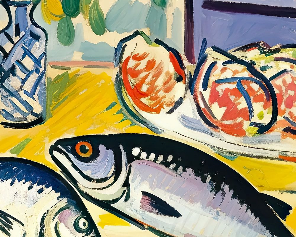 Dieses moderne Gemälde ist eine ausdrucksstarke Darstellung eines sommerlichen Esszimmer-Stilllebens. Das Werk zeigt einen gedeckten Tisch mit zwei Fischen, eine Vase mit Zweigen und eine Schüssel mit Speisen vor einem offenen Fenster.