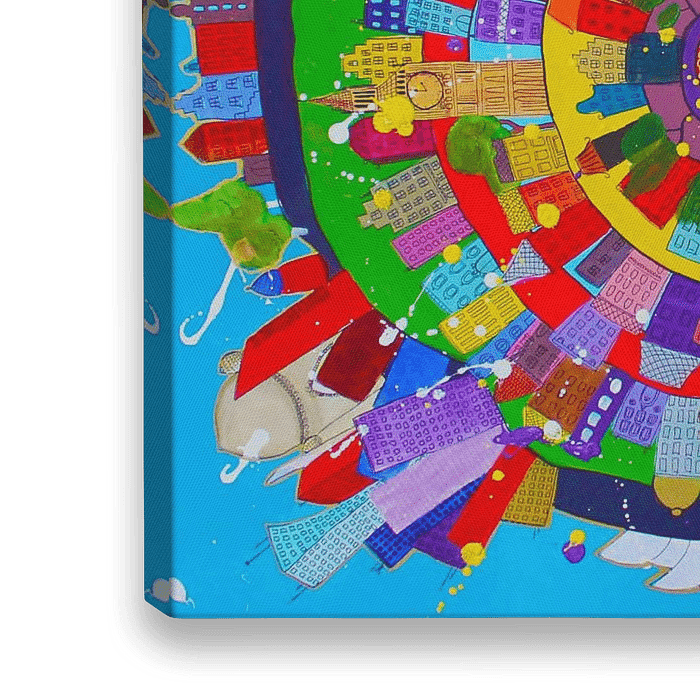 Wunderschönes, farbenfrohes Gemälde von Nicole Habets, das den Globus mit allen Häusern, Grachtenhäusern und Städten der Welt zeigt. Städte wie Sydney, Berge, Paris, Windmühlen, Amsterdam, Wälder und New York sind alle zu finden.