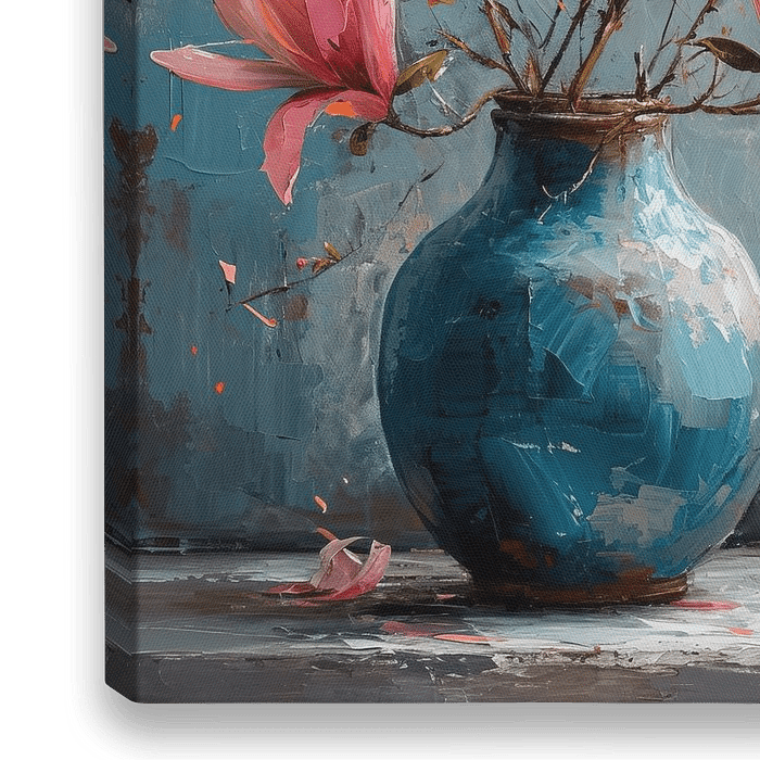 Details: Blumen, Vase, bunt, Stillleben, Leinwand, Kunst, rosa, blau, orange, grün