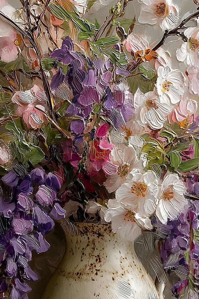Ein bezauberndes Stillleben, in dem eine rustikale weiße Vase mit Patina mit einem üppigen Strauß lila Flieder, zartrosa und weißen Blüten gefüllt ist. Die Komposition strahlt eine zeitlose Eleganz aus, wobei ein paar lose Blütenblätter auf der Oberfläche für ein subtiles Gefühl der Vergänglichkeit sorgen. Das sanfte Licht und der impressionistische Stil schaffen eine verträumte, nostalgische Atmosphäre.