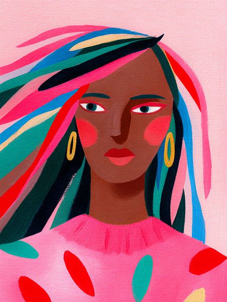 Bestelle dieses Porträt Buntes modernes Frauenporträt mit ausdrucksstarkem Blick von But First Framing als Reproduktion auf Leinwand, Alu-Dibond, als Poster, Fototapete oder Acrylglasbild.