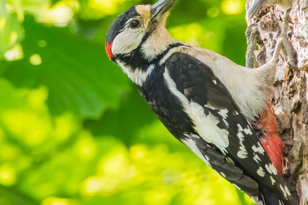 Buntspecht (Dendrocopos major) füttert im Frühling in einem Wald ein Küken in seiner Nisthöhle in einem Baum.