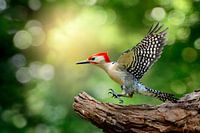 Ein lebhaft gefärbter Specht breitet seine Flügel aus, bereit zum Sprung. Sein leuchtend roter Kopf und das gemusterte Gefieder verleihen ihm eine unverwechselbare Präsenz, während die verwischte Grün-Hintergrundszene eine ruhige, magische Atmosphäre schafft. In diesem flüchtigen Moment vereint sich Eleganz mit der Kraft des Fliegens.