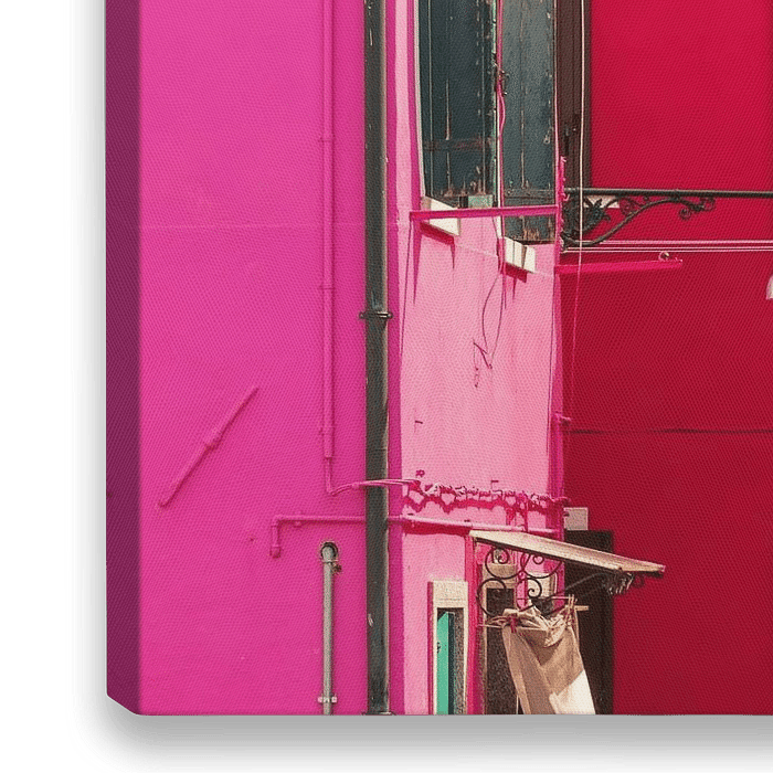 Bunter Innenhof mit dicht beieinander liegenden Wohnungen in verschiedenen Farben auf der Insel Burano bei Venedig.