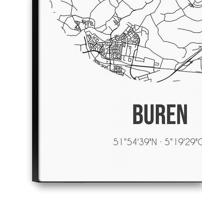 Schwarz-weiße Karte, Straßenkarte oder Straßenplan von Buren. Buren liegt in der Betuwe, in der Gemeinde Buren, Provinz Gelderland. Auf dem Stadtplan sind alle öffentlichen Straßen in Buren eingezeichnet. Außerdem enthält die Karte die Koordinaten des Zentrums von Buren.