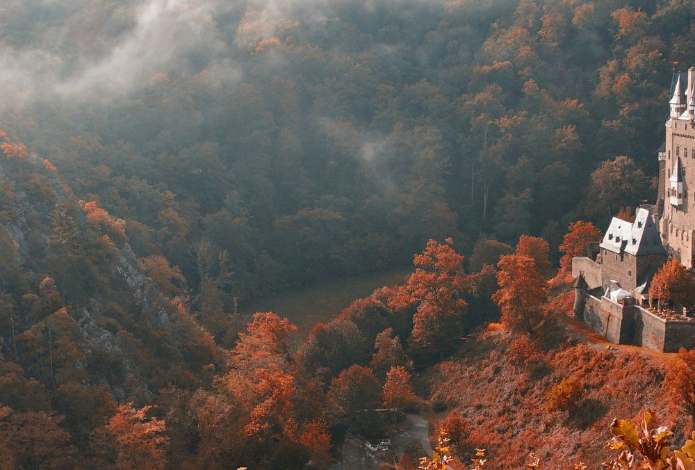 Diese schöne deutsche Burg befindet sich in der Nähe der Mosel, wenige Kilometer von Cochem entfernt. Im Herbst fegt der Morgennebel durch das Tal.