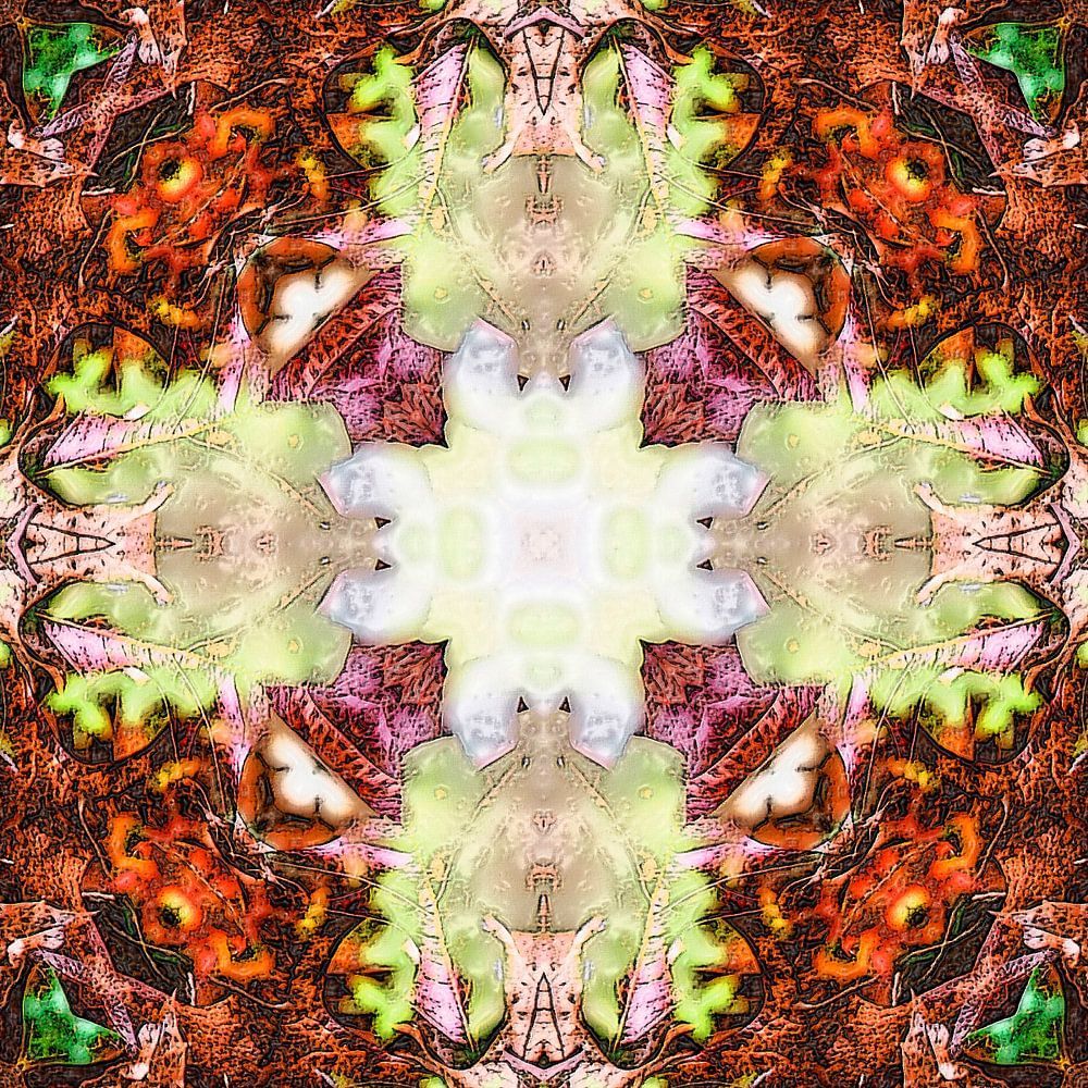 Ein kaleidoskopisches Bild mit überwiegend roten und braunen Tönen gruppiert um einen hellgrünen Kern, basiert auf einer Fotografie der Eichenblätter im Herbst.