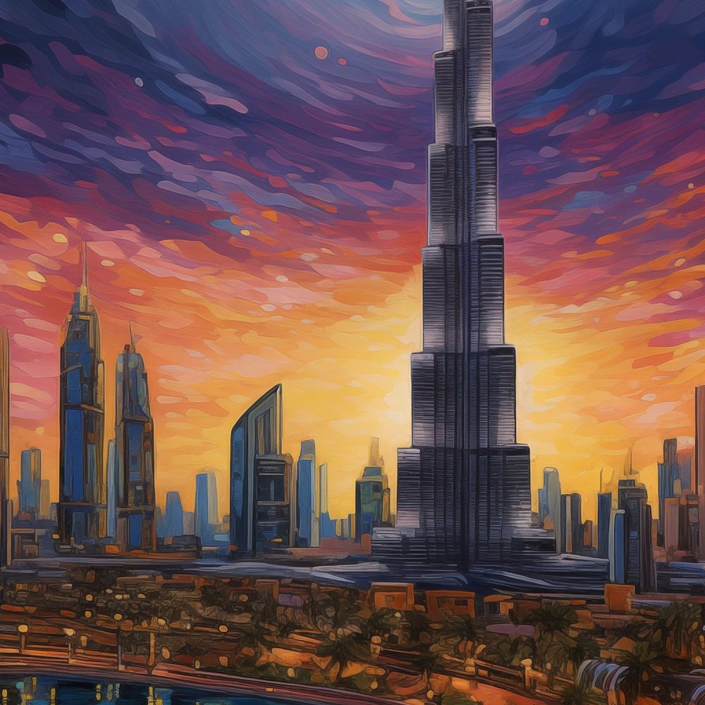 Einzigartiges Burj Khalifa Dubai-Gemälde im künstlerischen Stil. Mit schönen Farbtönen und einem einzigartigen Design ist dies ein stilvoller Fotodruck, der in jedem Raum gut aussieht.