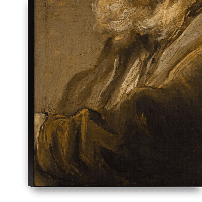 Dicht bij het beeldvlak gesitueerd, met het hoofd scherp gedraaid en de ogen naar beneden gericht, bruist de bejaarde man op Rembrandts kleine, monochrome olieverfschets van leven. Met zijn lippen lichtjes gespreid en zijn lichaam dat zich lijkt op te richten bij het passeren van een ademhaling, bewoont hij een wereld die bijna die van de kijker is. Rembrandts krachtige penseelstreken animeren het psychologische wezen en de fysieke aanwezigheid van de man, waardoor deze buste-lengte afbeelding veel groter lijkt dan hij in werkelijkheid is. Het licht dat van linksboven naar binnen valt, valt op de rechterkant van het gezicht van de oudere man en modelleert zijn driedimensionale vorm. Zijn ogen zijn open en alert en richten zich intens op iets buiten de compositie. Rembrandt benadrukte de emotionele energie van de man door het ritmische samenspel van grijzen en bruintinten en voegde okerkleurige en witte accenten toe aan de pezige baard en het krullende haar dat over zijn voorhoofd rolt. De buste van een bebaarde oude man is zowel delicaat als krachtig en bevat de diepe menselijkheid van Rembrandts beste werken). Dicht bij het beeldvlak gezeten, met het hoofd scherp gedraaid en de ogen naar beneden gericht, bruist de bejaarde man op Rembrandts kleine, monochrome olieverfschets van leven. Met zijn lippen lichtjes gespreid en zijn lichaam dat zich lijkt op te richten bij het passeren van een ademhaling, bewoont hij een wereld die bijna die van de kijker is. Rembrandts krachtige penseelstreken animeren het psychologische wezen en de fysieke aanwezigheid van de man, waardoor deze buste-lengte afbeelding veel groter lijkt dan hij in werkelijkheid is. Het licht dat van linksboven naar binnen valt, valt op de rechterkant van het gezicht van de oudere man en modelleert zijn driedimensionale vorm. Zijn ogen zijn open en alert en richten zich intens op iets buiten de compositie. Rembrandt benadrukte de emotionele energie van de man door het ritmische samenspel van grijzen en bruintinten en voegde okerkleurige en witte accenten toe aan de pezige baard en het krullende haar dat over zijn voorhoofd rolt. De buste van een bebaarde oude man is zowel delicaat als krachtig en omvat de diepe menselijkheid van Rembrandts beste werken.