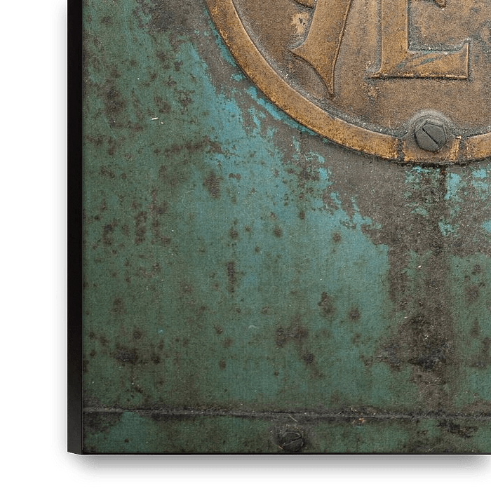 Emblem auf einer Industriemaschine. Schöne Blau-/Grüntöne. Rostige Stellen, verwitterte Spuren des Verfalls. Schön in einem industriellen Interieur. Suchen Sie ein anderes Werk, das zu diesem passt? Weitere Bilder dieser Art finden Sie im Album Industrial / Urban.