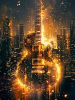 Was wäre die Welt ohne Musik? Cooles kraftvolles urbanes Design mit einer E-Gitarre. Fantastische dekorative Inszenierung in dunklen und goldnen Farben. Das Motiv ist in Zusammenarbeit mit KI entstanden.