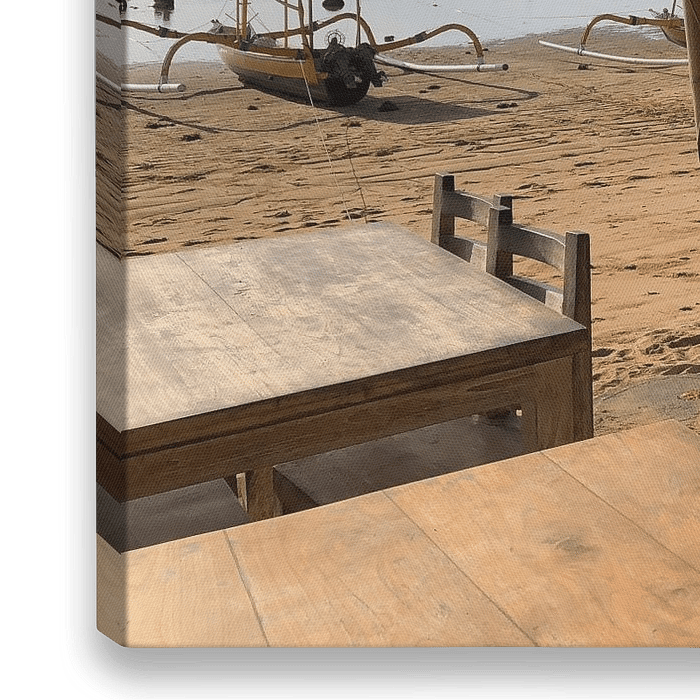 Bestelle dieses Landschafts-Wandbild Cafe Terrasse Strand Sanur Strand Bali von Raymond Wijngaard als Reproduktion auf Leinwand, Alu-Dibond, als Poster, Fototapete oder Acrylglasbild.