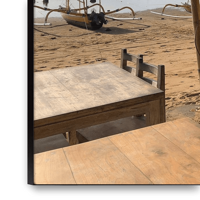 Bestelle dieses Landschafts-Wandbild Cafe Terrasse Strand Sanur Strand Bali von Raymond Wijngaard als Reproduktion auf Leinwand, Alu-Dibond, als Poster, Fototapete oder Acrylglasbild.