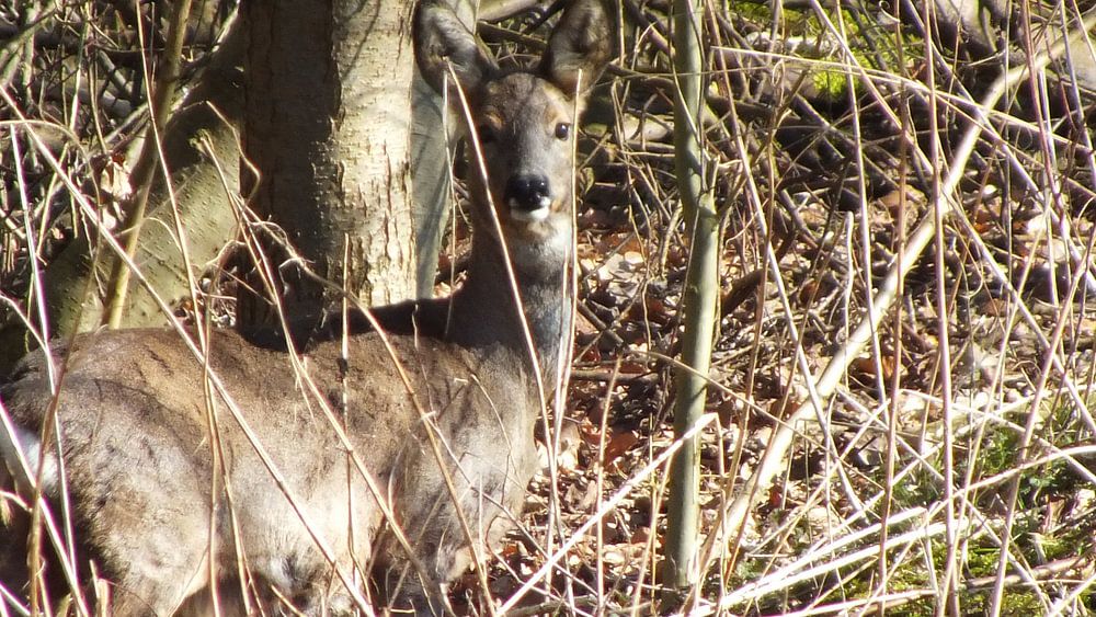 Hert in het bos met veel vertrouwen in z'n schutkleuren.