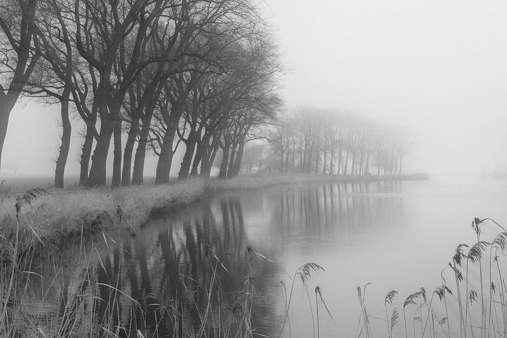 Alte Bäume, ein kleines Gewässer und Nebel geben der Landschaft diese Atmosphäre.