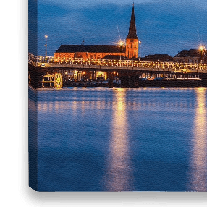Blick über die IJssel auf die Overijssel-Stadt Kampen während der blauen Stunde kurz nach Sonnenuntergang.
