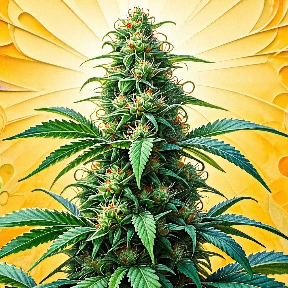 Dieses kunstvoll gestaltete Werk – in seiner Anmutung teils wie von Hand gemalt – entfaltet eine vielschichtige Hommage an die Cannabis-Pflanze und zelebriert deren natürliche Erhabenheit. Im Zentrum der Komposition thront eine prachtvoll blühende Cannabispflanze, deren dichte, harzreiche Blüten majestätisch emporragen. Sie erscheint wie eine Königin im Reich der Botanik, eingebettet in eine üppige, beinahe überbordende Flora. Ein lebendiges Mosaik aus farbenprächtigen Blüten und Pflanzen entfaltet sich um sie herum – eine Explosion organischer Farbigkeit, die das Auge fesselt und das Herz berührt.