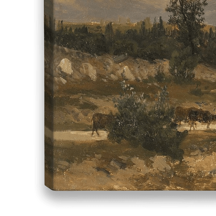 Bestelle Carlos de Haes-Weg Landschaft zurück zum Dorf, ländliche Idylle, antike Landschaft als Reproduktion auf Leinwand, Alu-Dibond, als Poster, Fototapete oder Acrylglasbild.