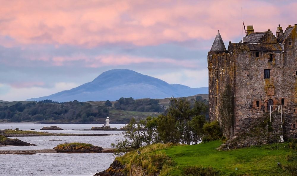 Foto von Castle Stalker in den schottischen Highlands kurz vor Sonnenuntergang