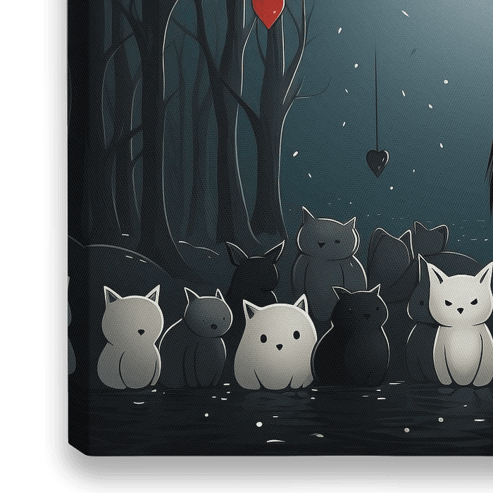 Spazieren Sie durch einen märchenhaften Winterwald, in dem ein Mädchen von Katzen in allen Formen und Farben umgeben ist. Der Himmel ist mit schwebenden Herzen gefüllt, die der Szene eine warme und bezaubernde Atmosphäre verleihen, perfekt für den Valentinstag. Diese Illustration ist nicht nur ein Fest der Liebe, sondern auch eine…