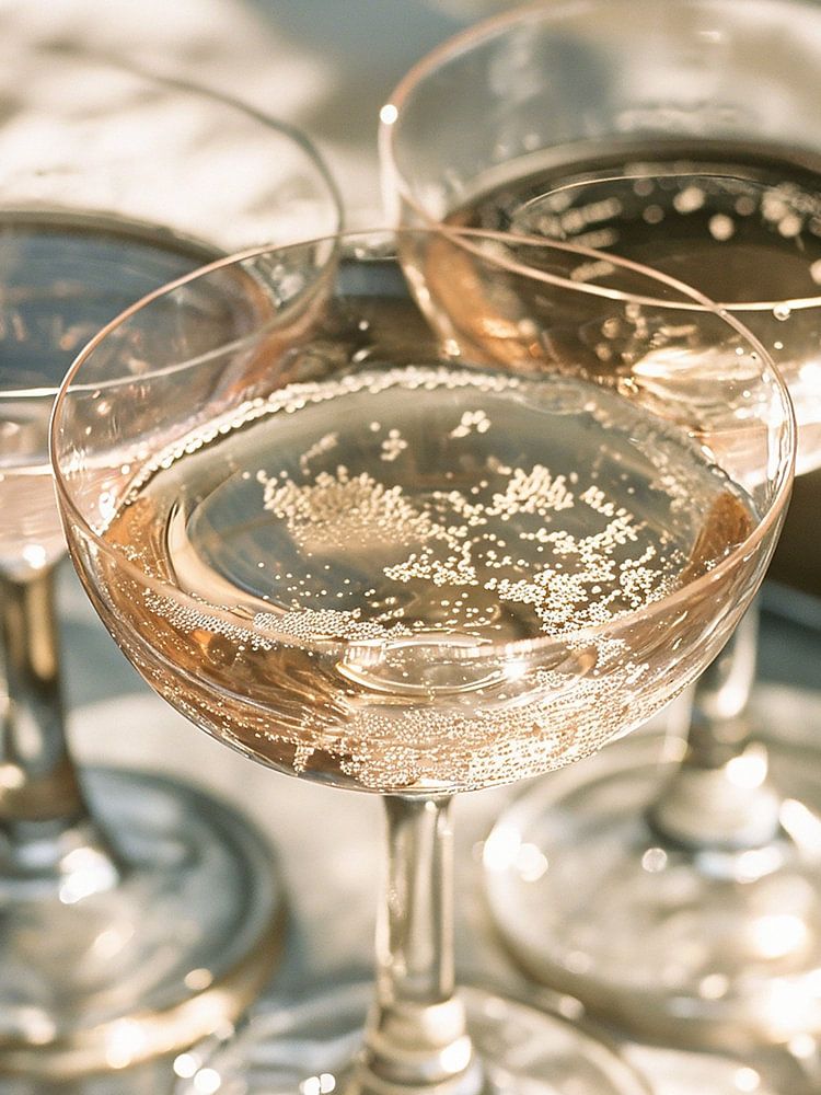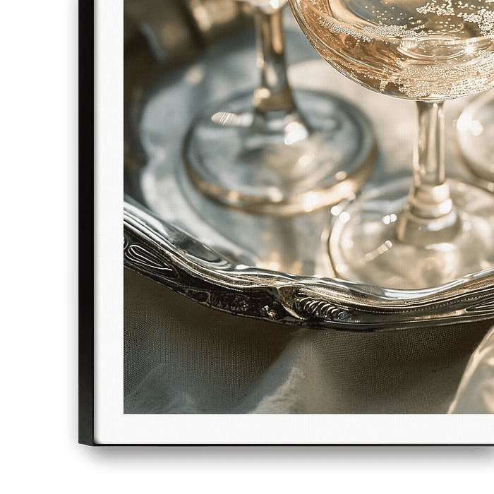 Drei Champagner-Gläser auf einem silbernen Tablett.