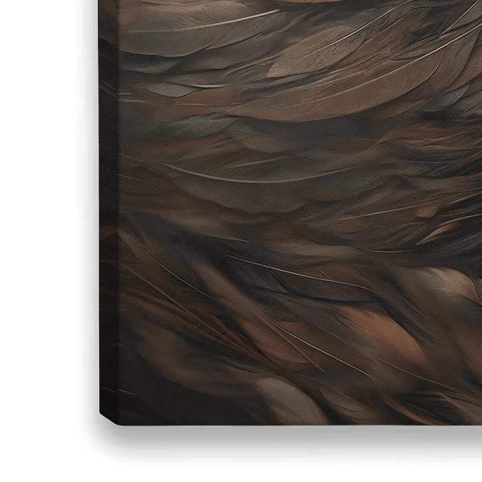 Abstraktes Fantasieporträt einer taffen Frau mit Federkopfschmuck aus Holz in warmen braunen Erdtönen.