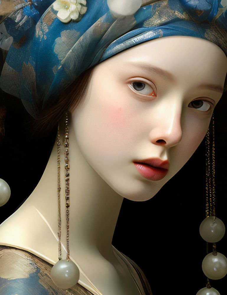 Porträt einer charmanten jungen Dame mit blauem Turban, blauen und weißen Blumen und großen Perlen. Im Stil des floralen Surrealismus mit chinesischem Kulturthema. Schattierungen von dunklem Azurblau.